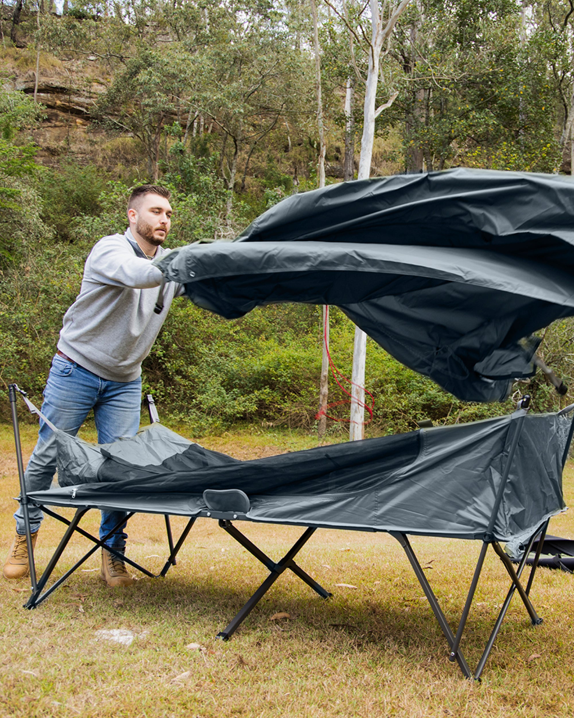 Super easy—no assembly required! The cot tent has an instant fold-out stretcher frame, so you just unfold it, attach the flysheet if needed, and you’re good to go.