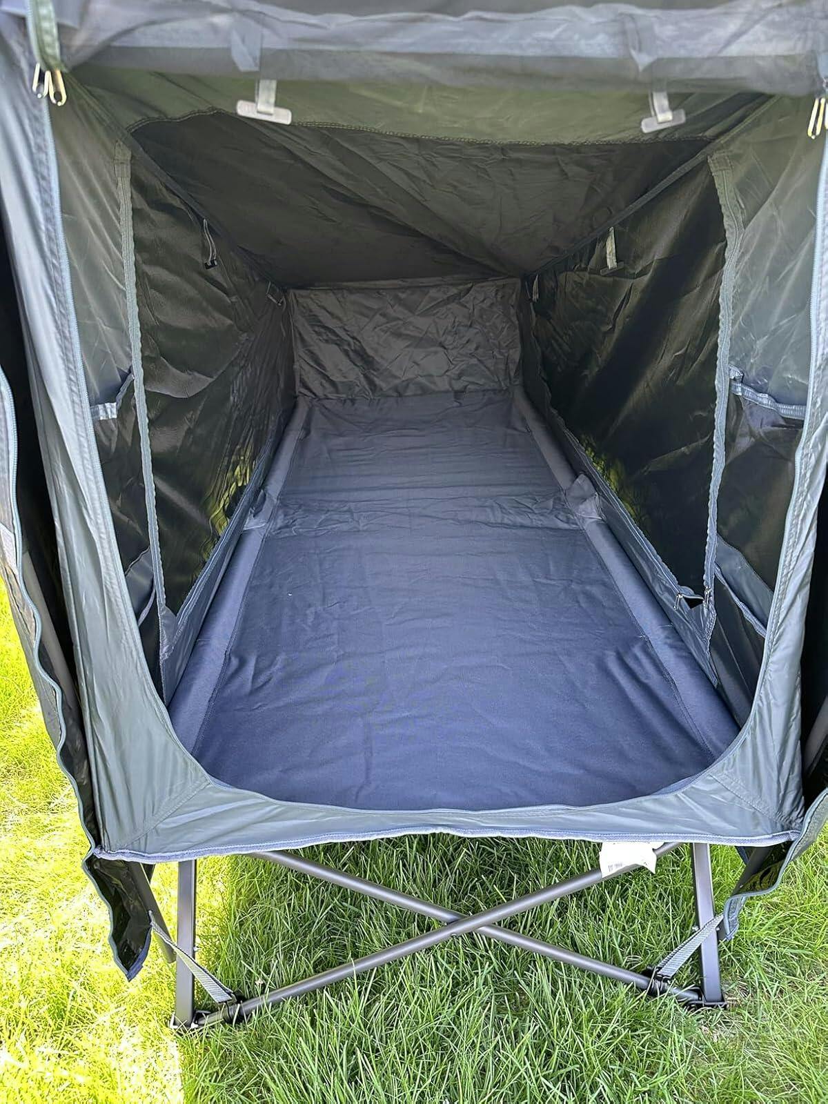 Super easy—no assembly required! The cot tent has an instant fold-out stretcher frame, so you just unfold it, attach the flysheet if needed, and you’re good to go.