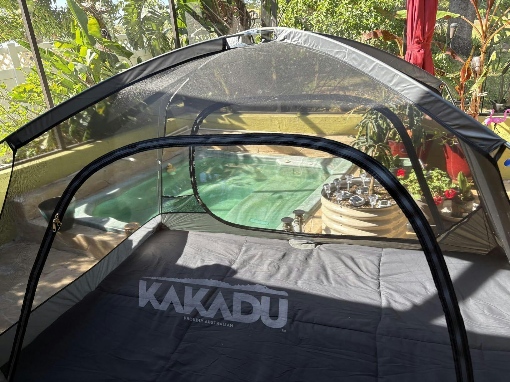 Unlike a regular tent, this beauty sits off the ground on a sturdy stretcher frame, making it easier to get in and out while keeping you dry, comfy, and away from creepy crawlies.